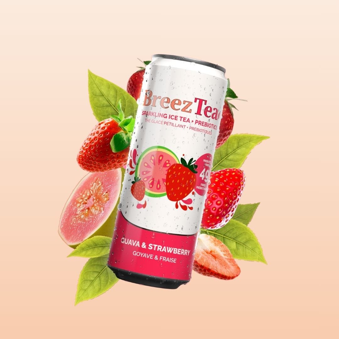 Experience the lush, sweet harmony of ripe guava and succulent strawberries blended with refreshing green tea. This low-calorie sparkling iced tea is brightened with a splash of lime and naturally sweetened with monk fruit for a clean, crisp finish. Infused with prebiotics and a touch of Himalayan salt, Guava & Strawberry BreezTea is your go-to for guilt-free, delicious hydration that captures the essence of summer in every bubble.